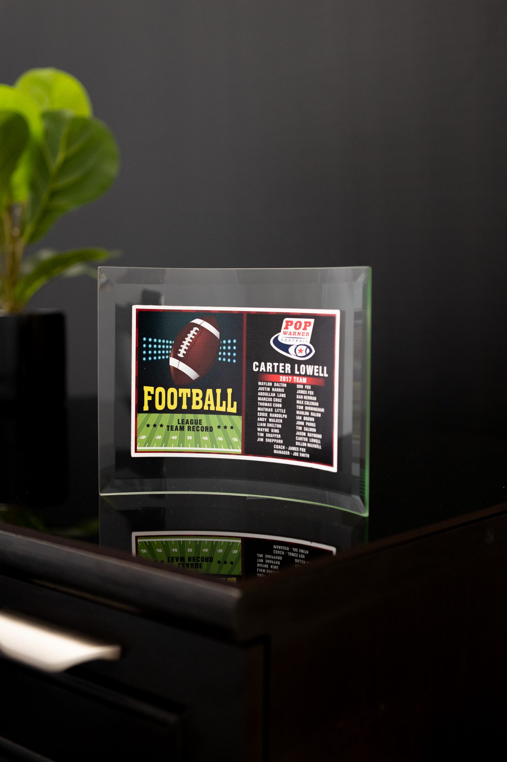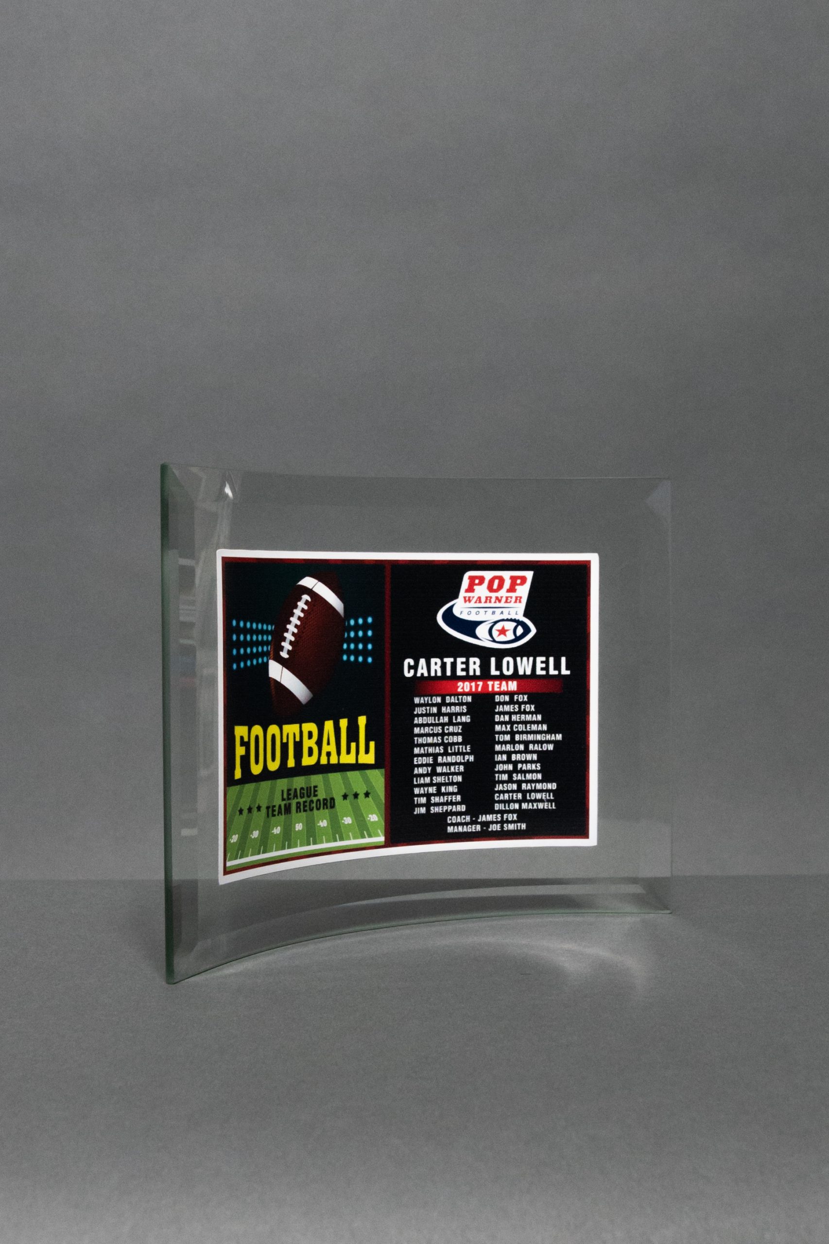 Your championship team will be astonished with the visuals on this award. The Glass Crescent Award has a full colored vinyl that is applied to the glass. It is the ultimate way to promote your team organization. The picture on this beauty is a piece of art that your best performers will ogle at in the best of ways. It is individually and neatly packed for protection.